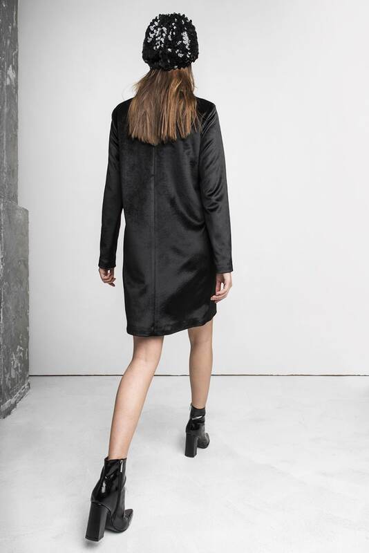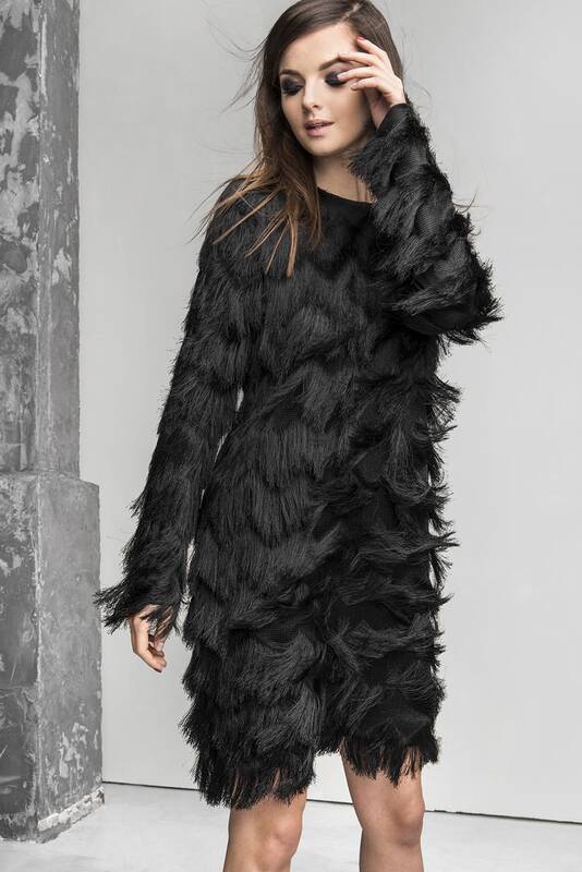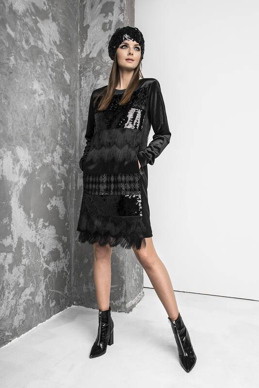 Kūrėja pristatė šventinę kolekciją. Joje – šešių skirtingų modelių juodos spalvos suknelės, kuriose dera aksomas, žakardas, žvilgantys žvyneliai, kutai.