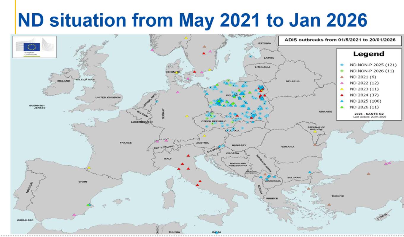 2025–2026 m. dėl Niukaslio ligos protrūkių labiausiai nukentėjo Lenkijos ūkiai, kur nustatyta net 130 protrūkių, daugiausia mėsinių viščiukų (broilerių) ūkiuose. Didžioji dalis užsikrėtimo atvejų – nevakcinuotuose ūkiuose. 2025 m. pabaigoje liga plito ir Ispanijoje – patvirtinti net 5 protrūkiai, Latvijoje ši liga taip pat patvirtinta – vienas protrūkis nekomerciniame paukščių ūkyje. ES dėl Niukaslio ligos nugaišo arba buvo sunaikinta apie 13,3 mln. paukščių.