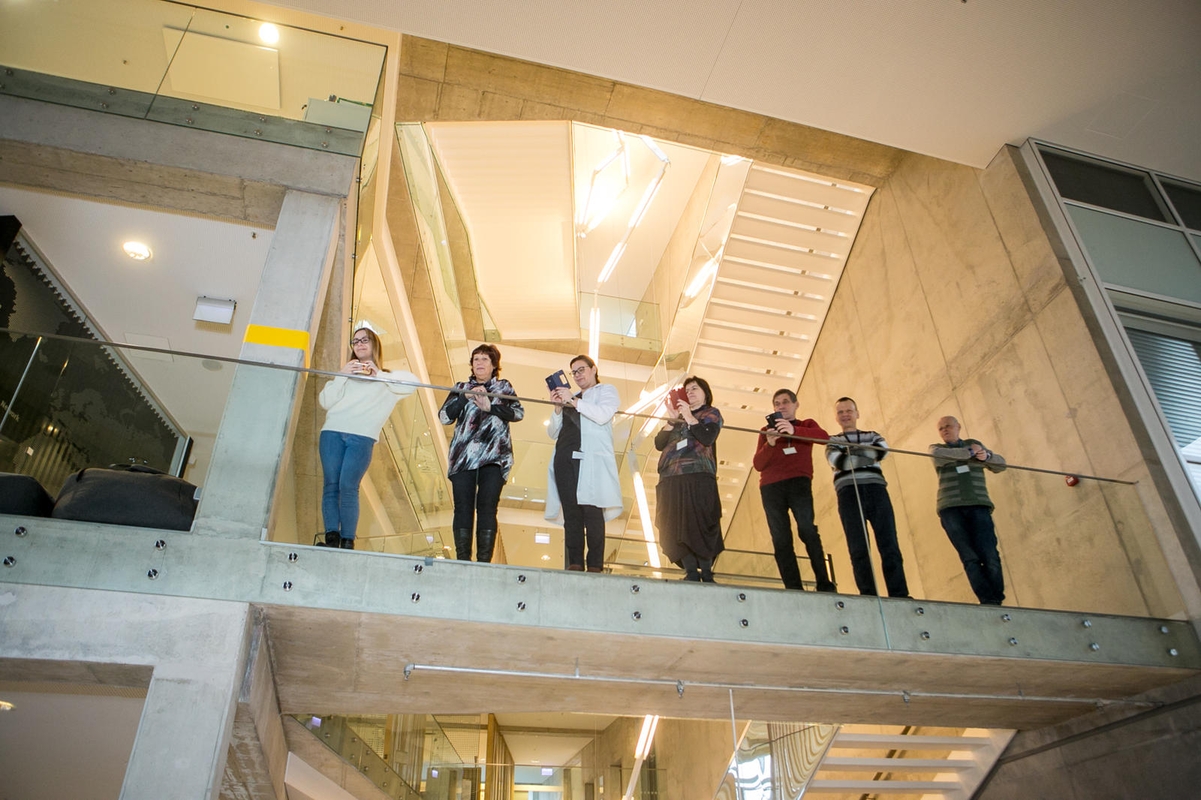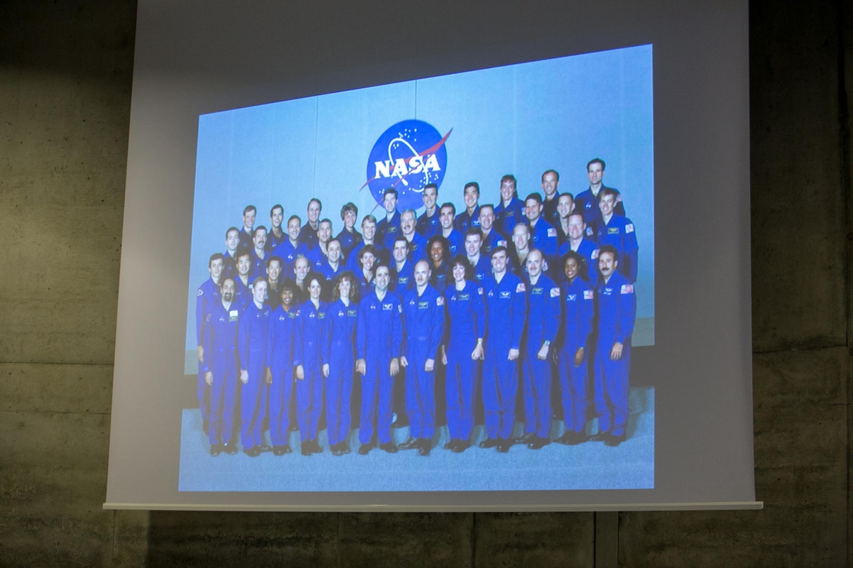Komanda: J.Payette auditorijai rodė fotografijas, primenančias jos 21-erių metų astronautės veiklą. Pirmasis skrydis į kosmosą – su penkiais JAV ir vienu Rusijos atstovu. Vilmanto Raupelio nuotr.