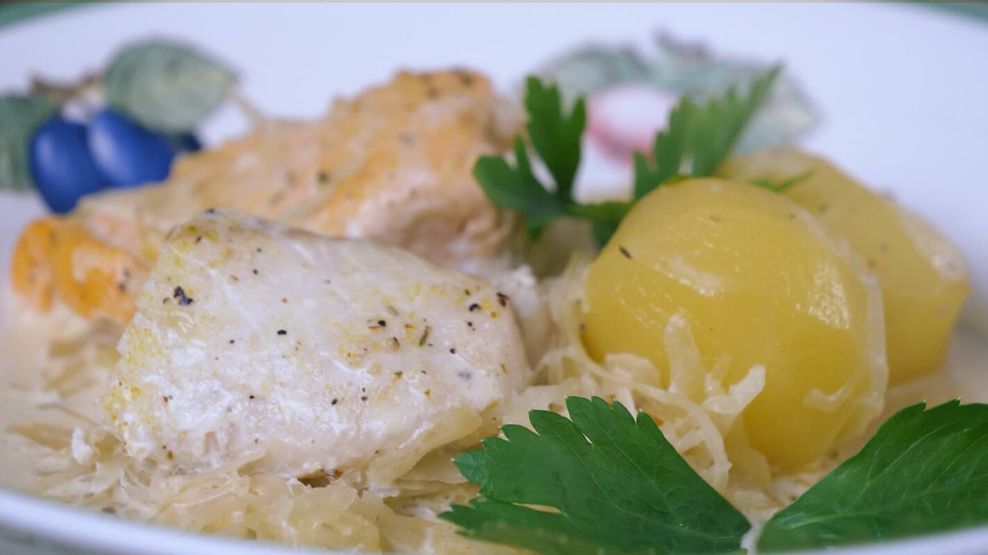Į lėkštę įdėkite šiek tiek kopūstų, kelias bulves, žuvį ir viską užpilkite padažu. Skanaus!