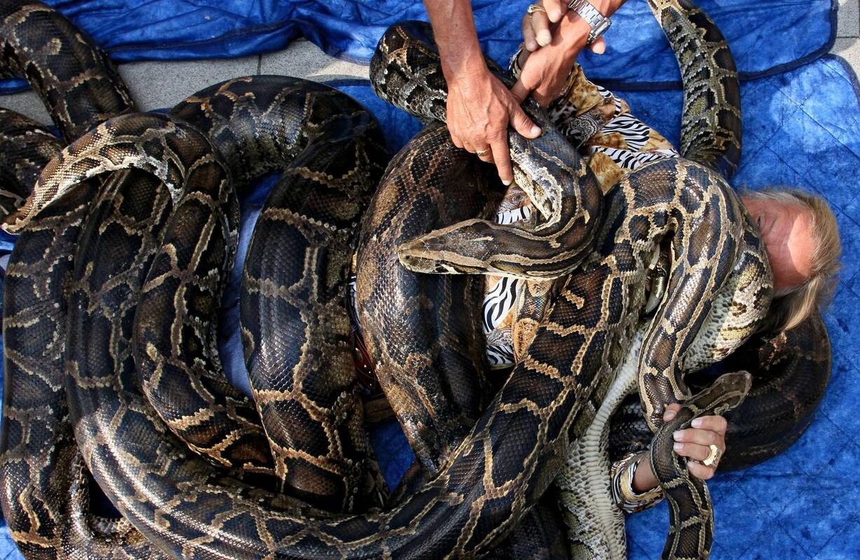 Gyvąją "antklodę" sudarė trys paprastieji smaugliai ir du pitonai: kiekvienas jų apie penkių metrų ilgio, o jų visų svoris viršijo 500 kilogramų. Nė neįtartum, kad tokį sunkumą teko tverti šypsena pasipuošusiam ekstremalui.