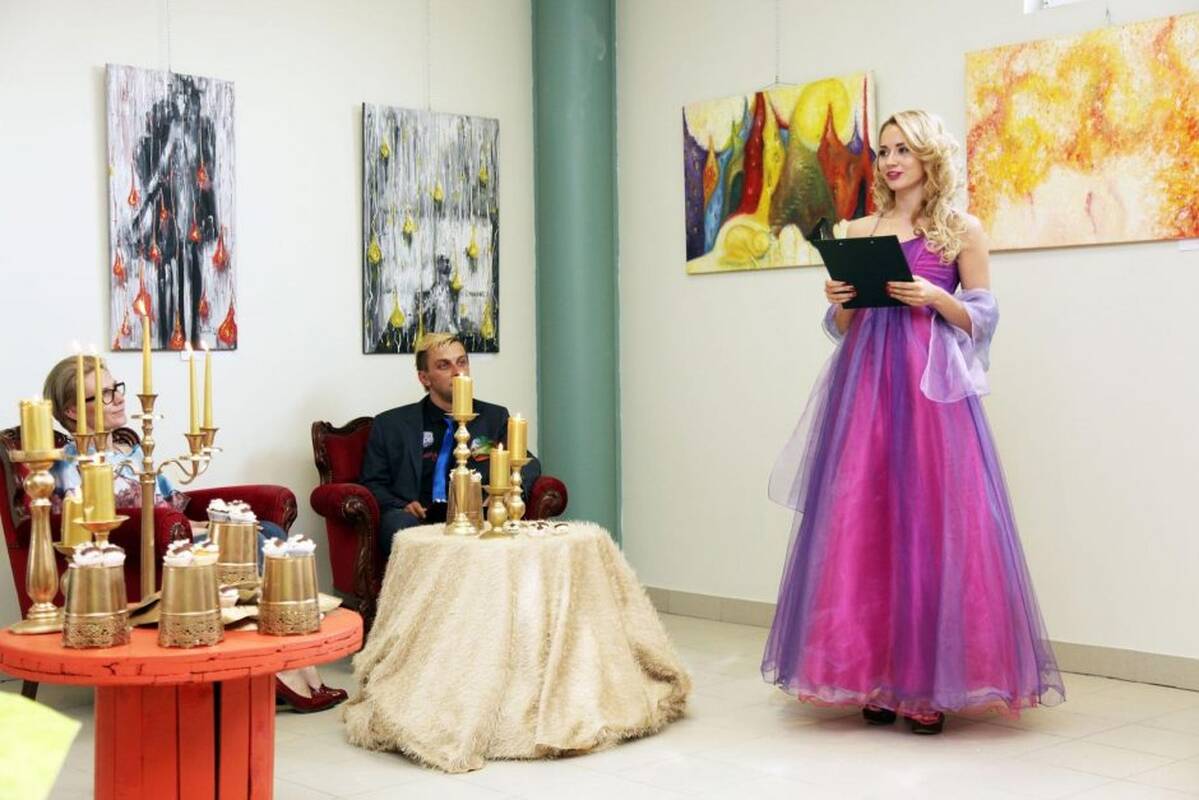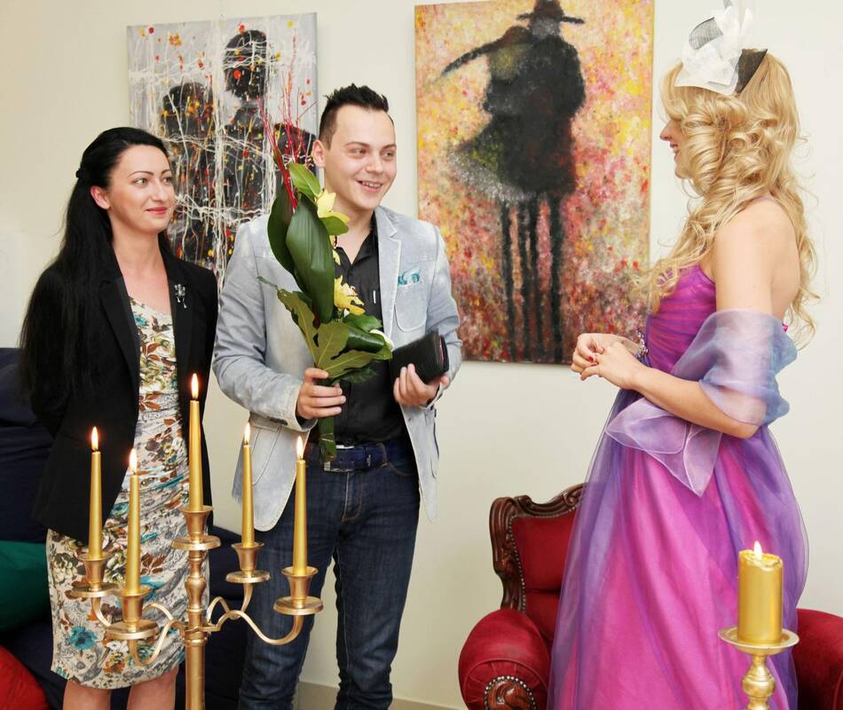 Po oficialaus parodos atidarymo ir pašnekesio su Rasa Art apie piešinius bei tapybą ant šilko, jis greta savęs pasikvietė R Mazurevičiūtę.
