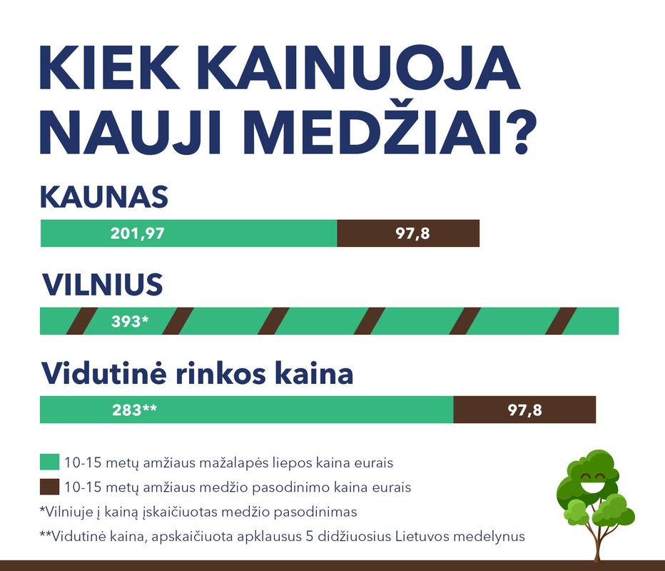 Kaune vieno tokio dydžio medžio pasodinimas kainuoja 97,8 Eur. Įvertinus viešai prieinamus šaltinius, keturiuose didžiausiuose šalies medelynuose vidutinė vieno tokio medžio kaina siekia apie 283 Eur.