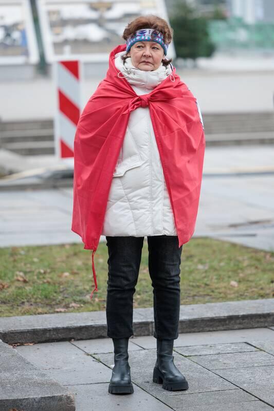 Prie „Laisvės“ paminklo sutikta ponia Liuda B., apsijuosusi istorine Lietuvos vėliava, tikino, kad jai neramu dėl to, kas dabar vyksta valstybėje ir ji nenori grįžti į laikus, kai nebuvo galima kalbėti.