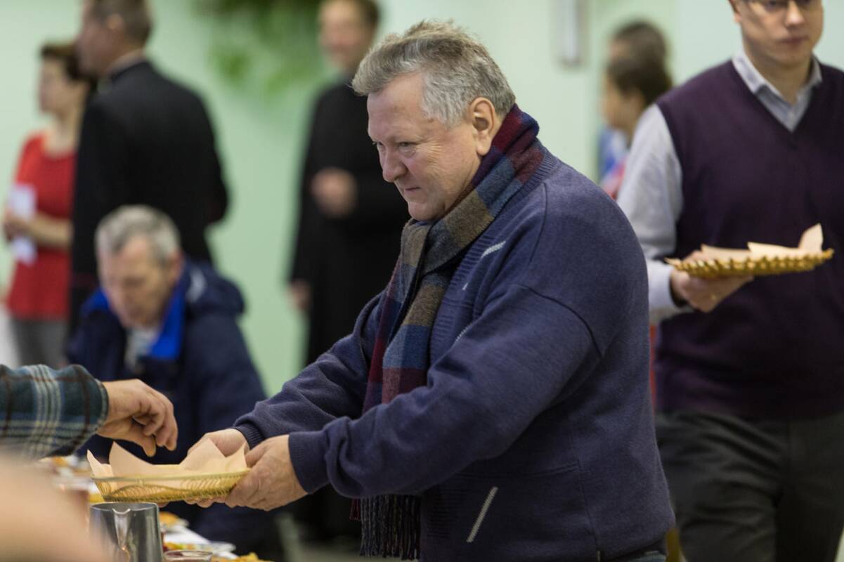 Šventiniai Kūčių pusryčiai pradėti malda, padėka darbuotojams, savanoriams ir kuo geriausiais linkėjimais visiems susirinkusiems.