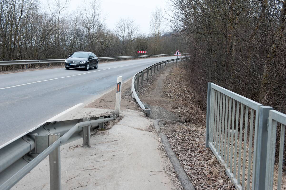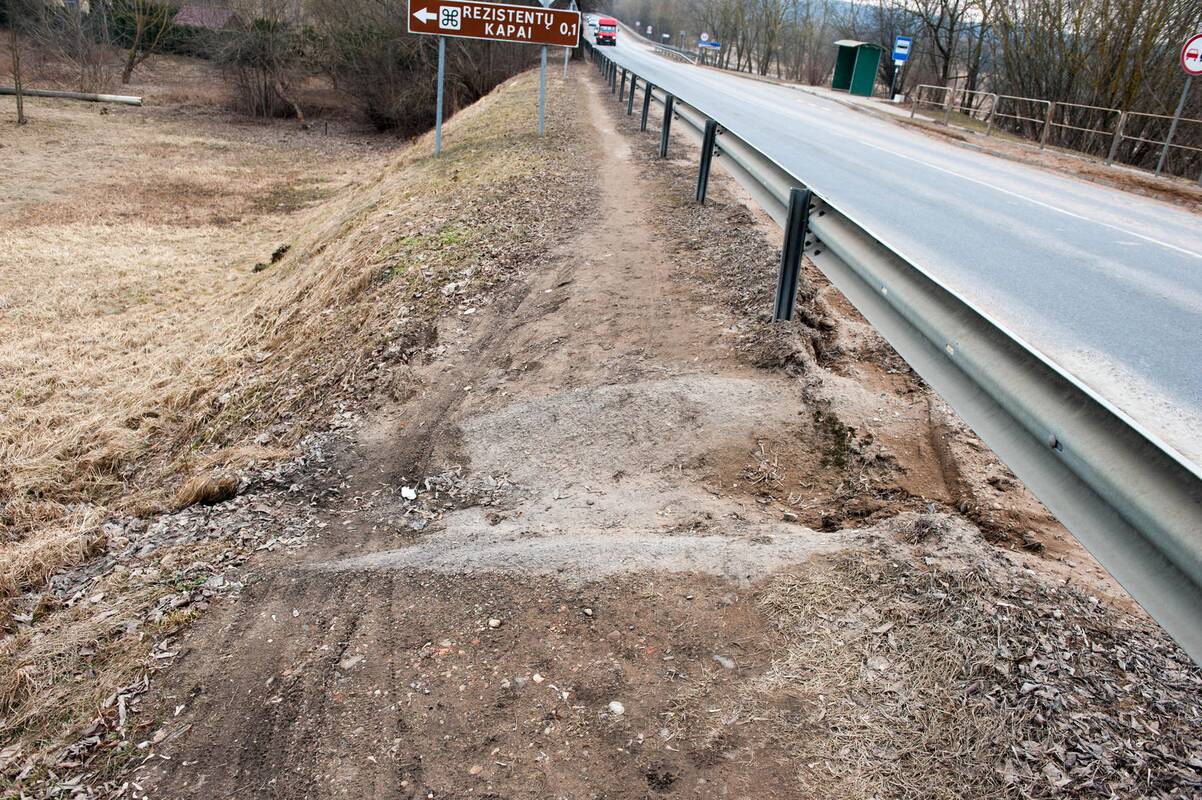 "Ten pėsčiųjų ir dviračių tako visai nėra. Yra parengtas projektas, darbus žadama pradėta antrame metų ketvirtyje. Kol kas visi dviratininkai važiuoja važiuojamąja kelio dalimi, o atsargesni naudojasi už kelio atitvarų pramintu takeliu", – pasakojo seniūnė, patvirtinusi, kad nuokalnėje esantį takelį gadina šlaitu žemyn nubėgantis vanduo.