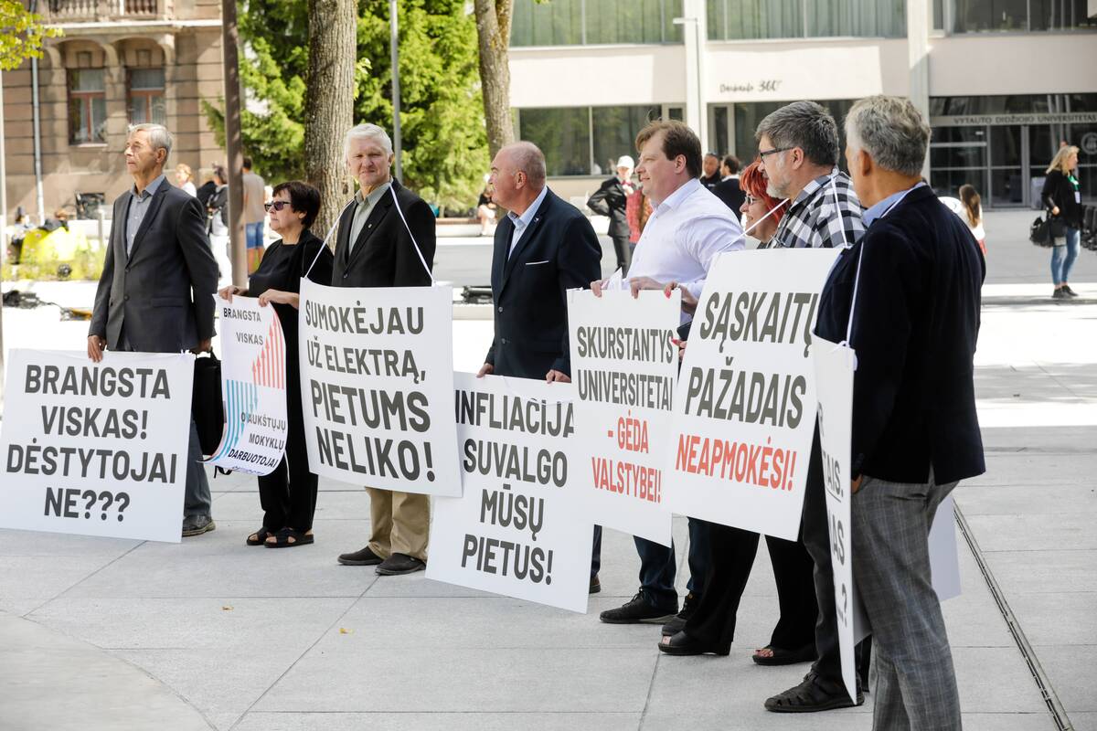 Apie dešimt profesinių sąjungų atstovų pasitiko šventines studentų eitynes, laikydami plakatus „Sumokėjau už elektrą, pietums neliko!“, „Skurstantys universitetai – gėda valstybei“ ar „Sąskaitų pažadais neapmokėsi“.