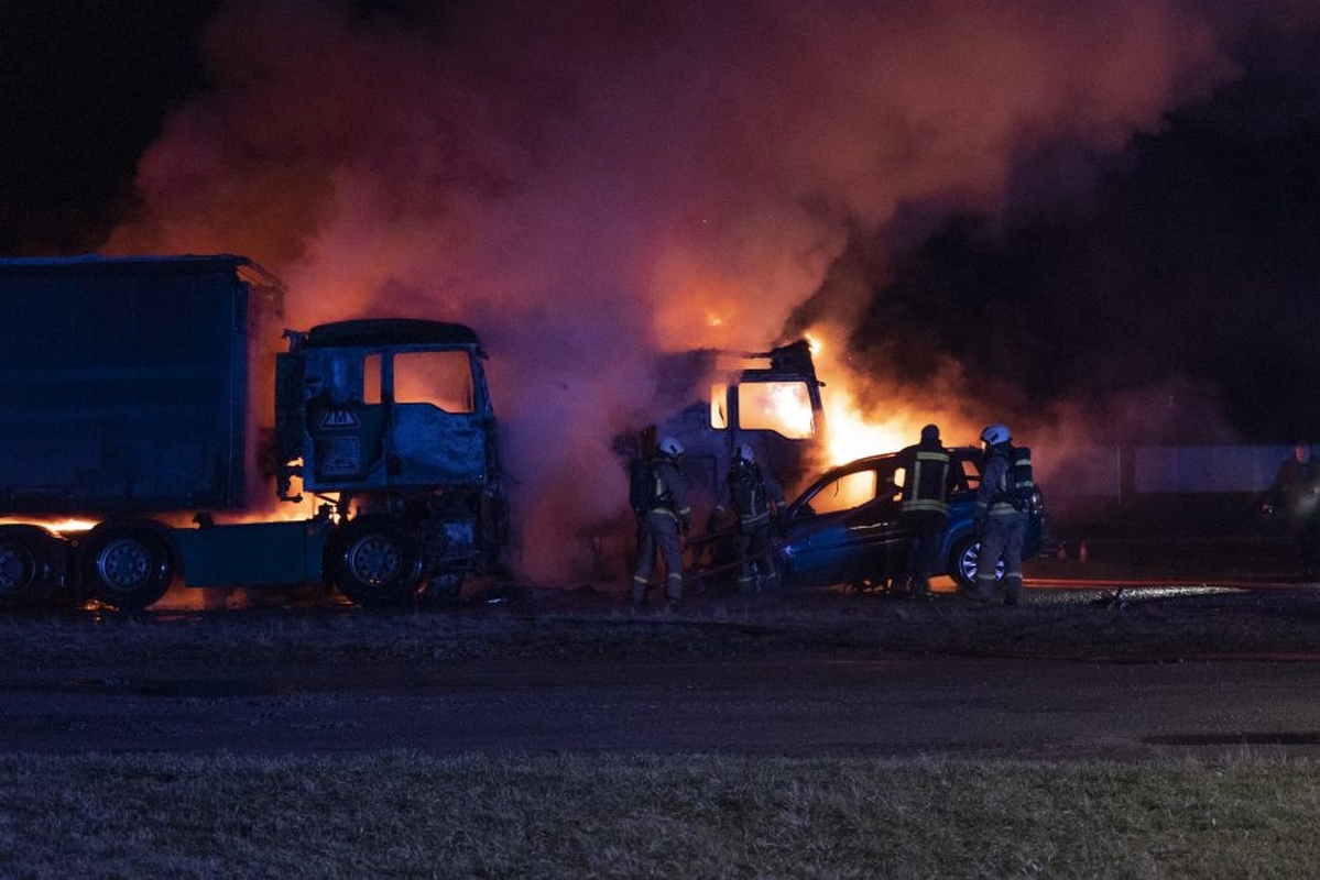 Nors trys transporto priemonės sudegė, ugniagesiams pavyko išgelbėti šešis vilkikus ir autobusą.