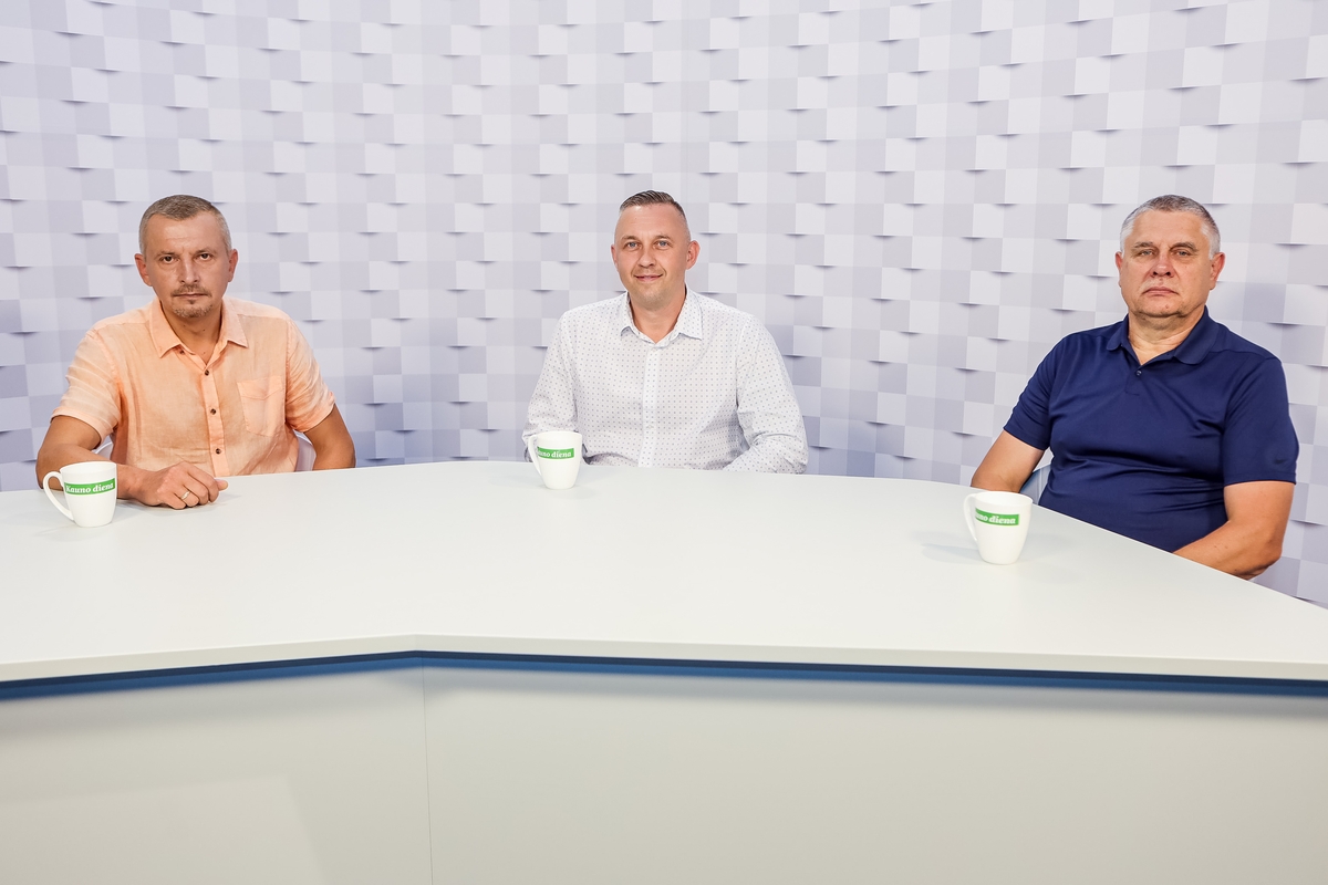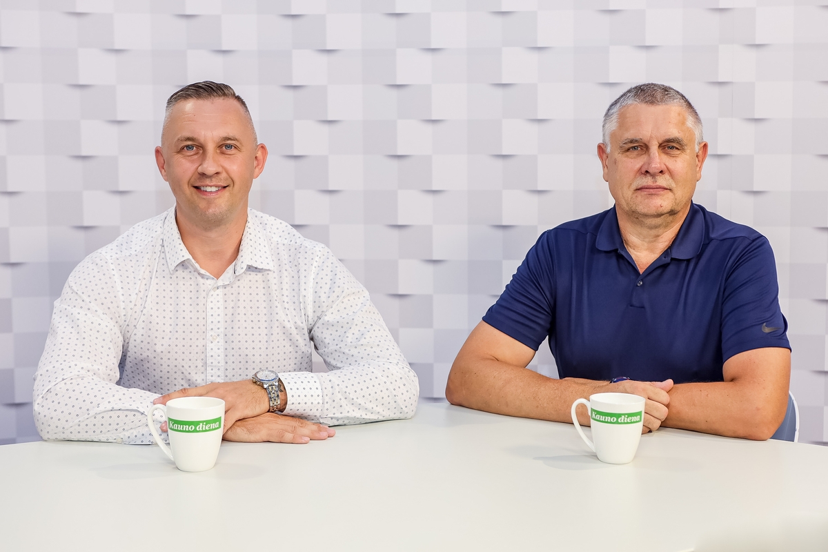 Klubo direktorius P. Aleksonis „Kauno dienos“ studijoje pristato naująjį komandos trenerį – dabar Lietuvos moterų krepšinio rinktinę treniruojantį Rimantą Grigą.