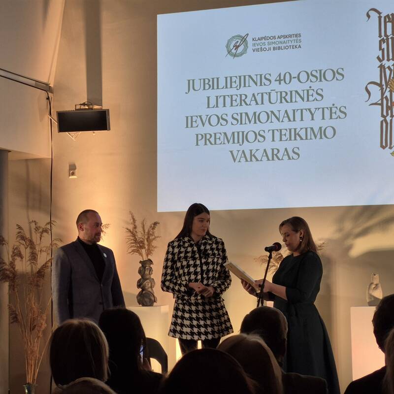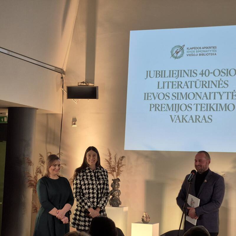 Įteikti premiją rašytojui į sceną buvo pakviestos dr. L. Šimkevič ir renginio mecenato atstovė Rugilė Cibauskaitė.