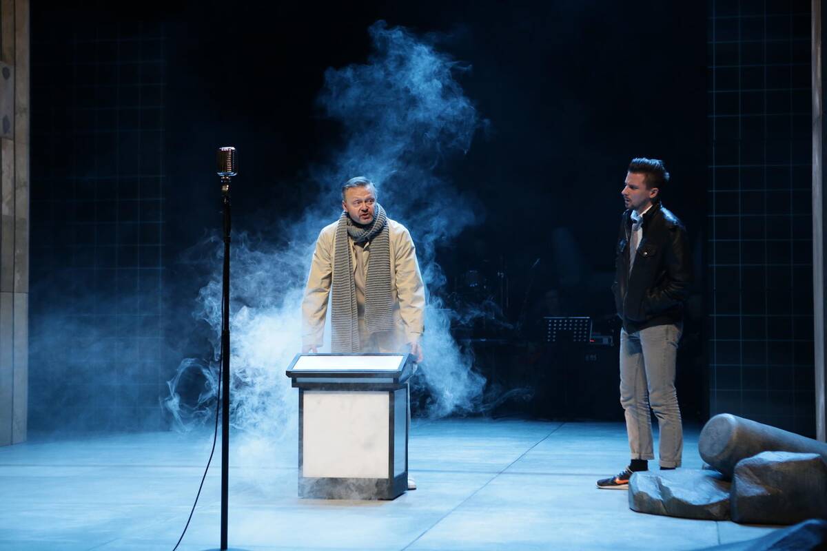 Naujas spektaklis vadinamas kone miuziklu. Muziką sukūrė kompozitorius Antanas Jasenka. „Spektaklio laikas muzikiniu požiūriu labai susietas su išsivadavimu, išjudėjimu, o tai yra pankroko muzika. Gintaras yra roko grupės „Kontrabanda“ lyderis, tad tapo aišku, kad spektakliui reikia ir šios grupės. Be mano sukurtų dešimties dainų, įtraukėme ir du Gintaro grupės kūrinius. Išėjo muzikinis spektaklis, kuris įrėmina visas mizanscenas. Kažkas įvyksta ir suskamba daina, lyg padedamas taškas. Šiame spektaklyje pankroko lyrika labai pritampa. Aktoriai puikiai dainuoja, nors man buvo sakyta, kad čia nėra dainuojančių aktorių“, – pasakojo Klaipėdos dramos teatre debiutuojantis kompozitorius A.Jasenka.