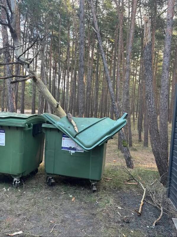 Žvejų gatvėje dėl stipraus vėjo lūžo medis. Krisdamas jis sulaužė atliekų konteinerį, aplink mėtėsi šakos.
