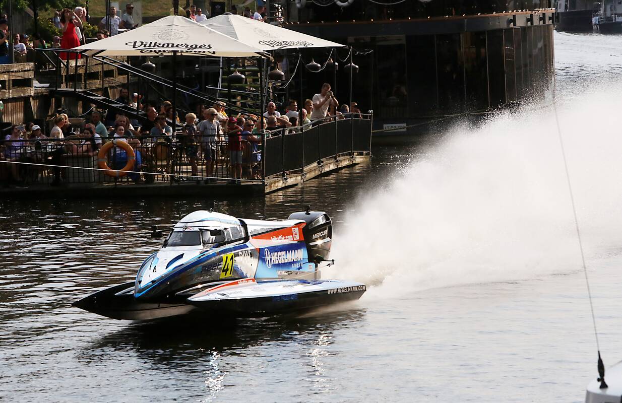 Trečiadienio vakarą Dangės krantines apgulė klaipėdiečiai, jie žinojo, kad upe pralėks Lietuvos motorlaivių sporto asas Edgaras Riabko. Kelis kartus privertęs savo bolidą plaukti 180 km/val. greičiu.