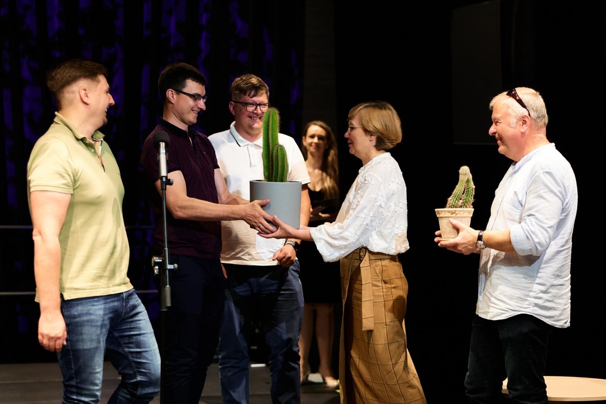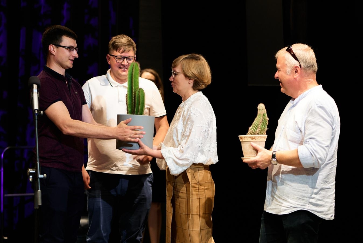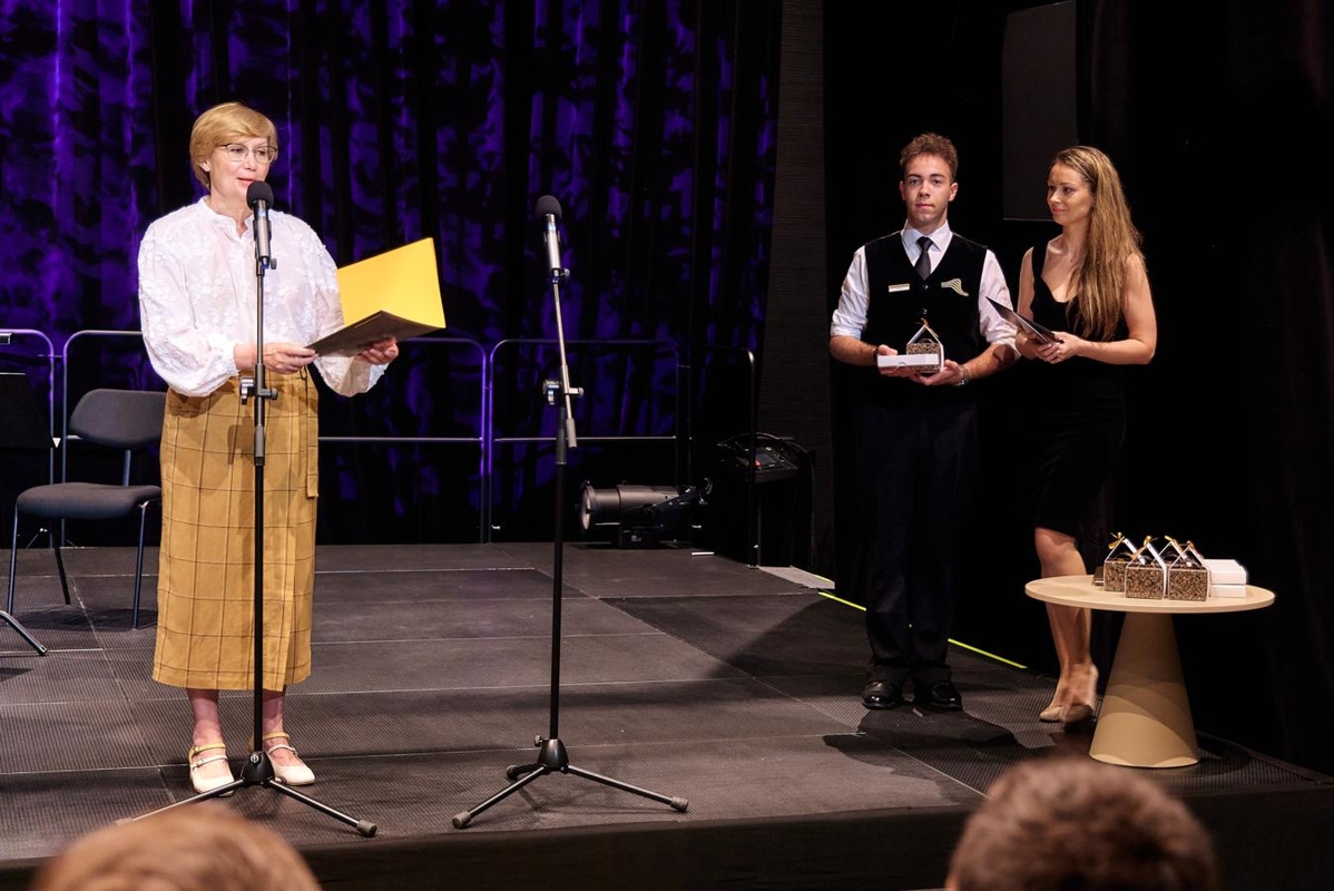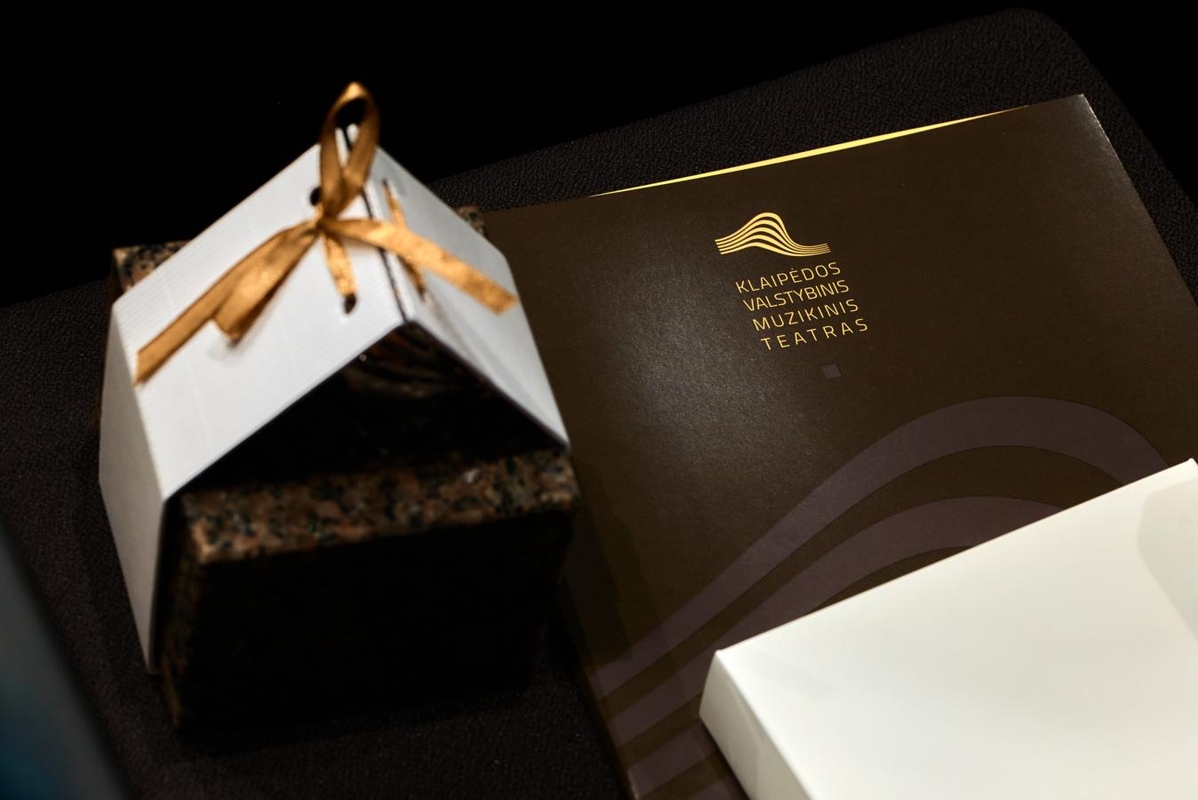 KVMT vadovė L. Vilimienė už nuoširdų bendradarbiavimą ir profesionalumą įgyvendinant KVMT teatro statybų projektą skyrė padėkas UAB „Infes“ generaliniam direktoriui Arvydui Markevičiui, projektų direktoriui Mantui Šalčiui ir statybos projektų vadovui Martynui Dargužui. Už atsidavimą, strateginį mąstymą ir procesų valdymo optimizavimą įgyvendinant statybų projektą nuoširdžiai dėkota ir KVMT pastato modernizavimo projekto vadovui Nagliui Stancikui, o už kokybišką ir efektyvų investicinių procesų vykdymą – KVMT investicinių projektų koordinatorei Daivai Daugei. Jiems įteiktos ir skulptūrinės miniatiūros „Klaipėda ant bangos“, pagamintos iš senojo pastato laiptų akmens. Granito plokštė buvo išmontuota ir virto unikaliais suvenyrais. Skulptorius Vytautas Karčiauskas sukūrė skulptūrines miniatiūras, kuriose susijungia granitas, nerūdijantis plienas, bronza ir Baltijos gintaras.