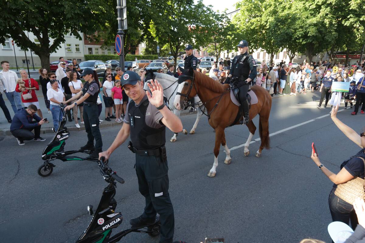 Eisenos dalyviai žiūrovams prisistatė stulbinančiai išradingai. Už Pilies tilto įrengtoje pakyloje juos pasitiko garbingi svečiai, atvykę iš užsienio šalių pasveikinti Lietuvos Karinių jūrų pajėgų su jubiliejumi.