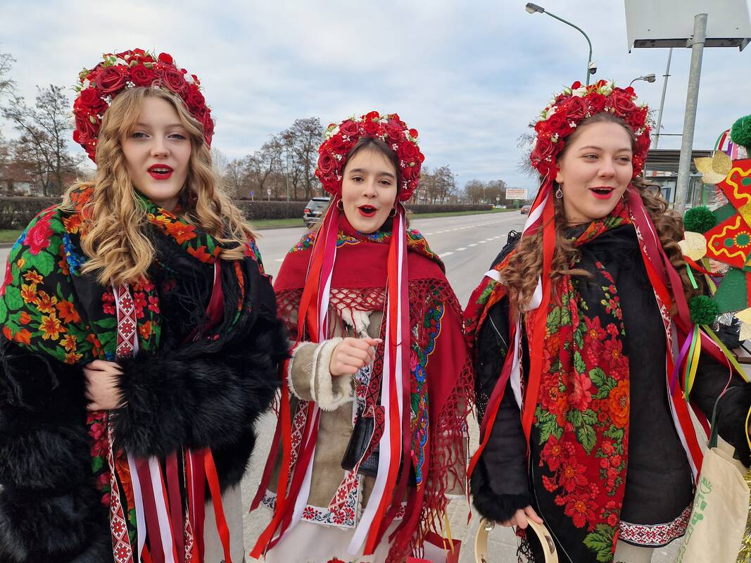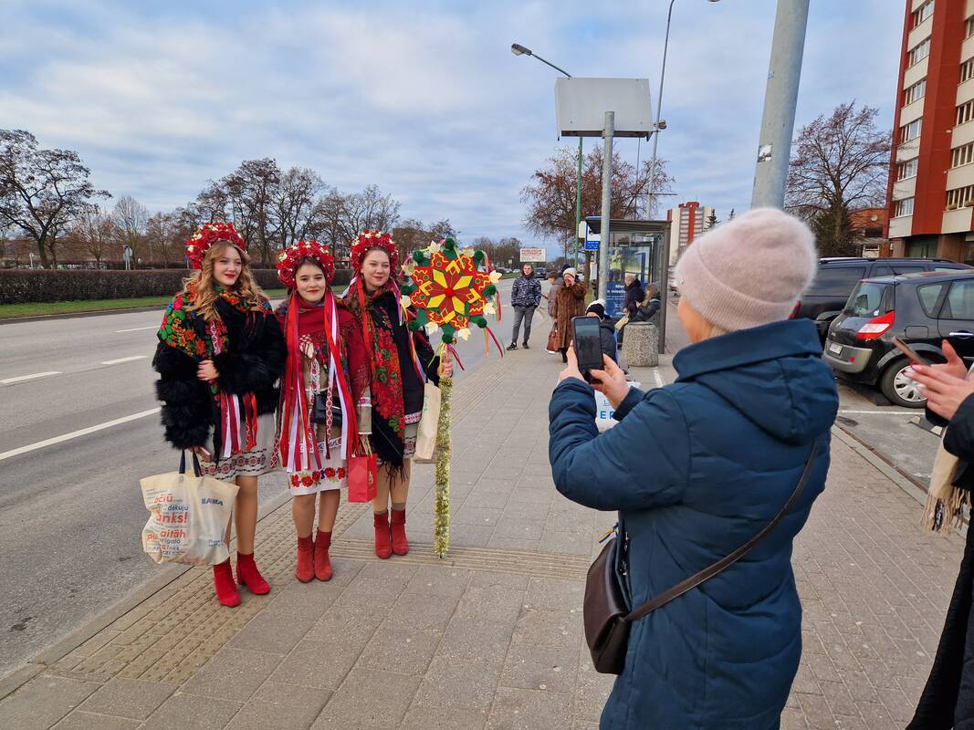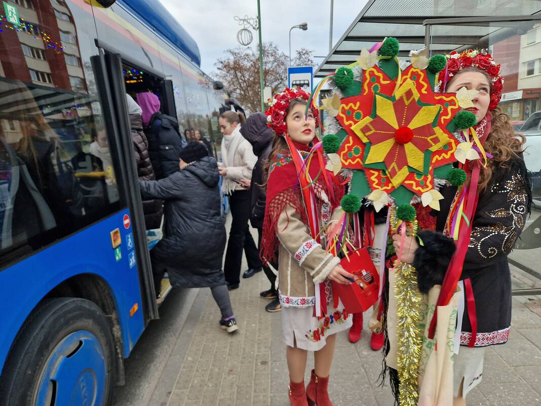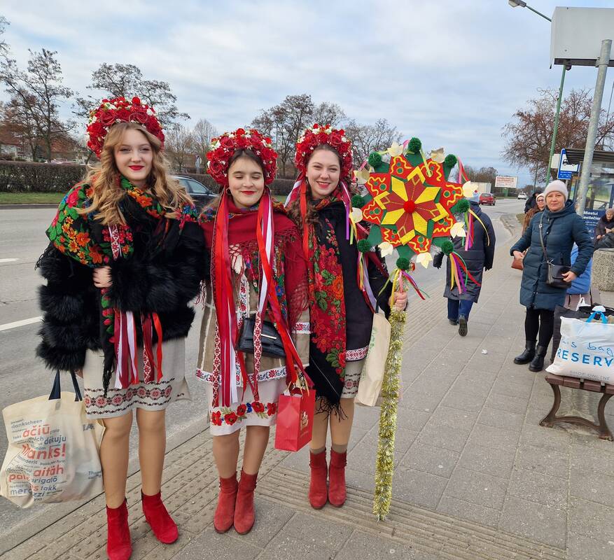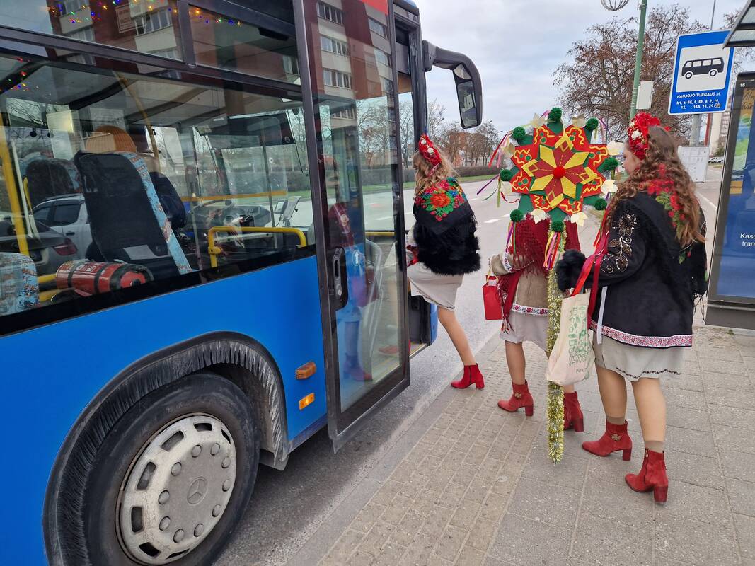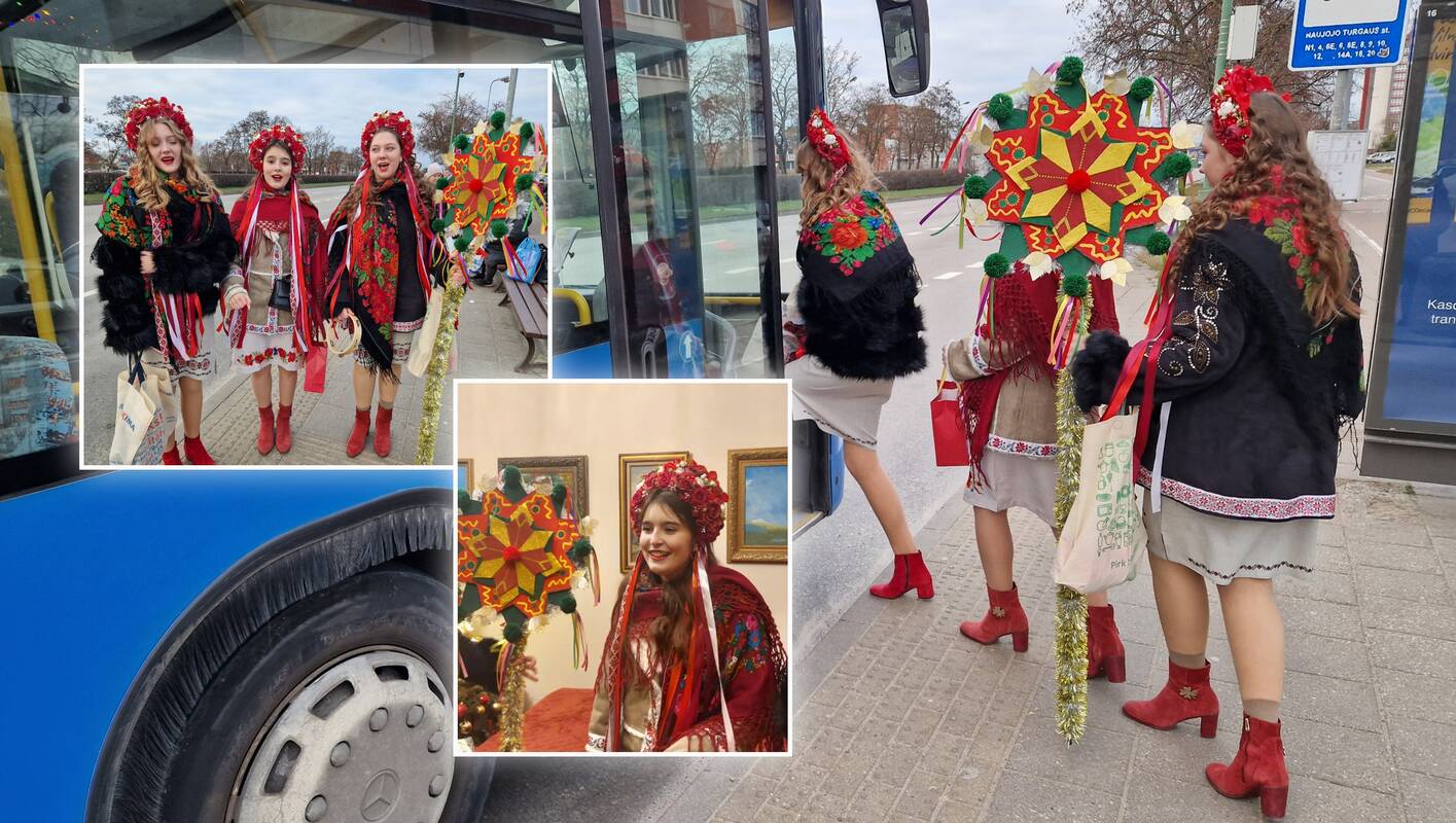Pasipuošusios ryškiais rūbais, nešinos simboline žvaigžde ir būgneliais, Sofija, Viktorija ir Julija atėjo į autobusų stotelę prie naujosios turgavietės.