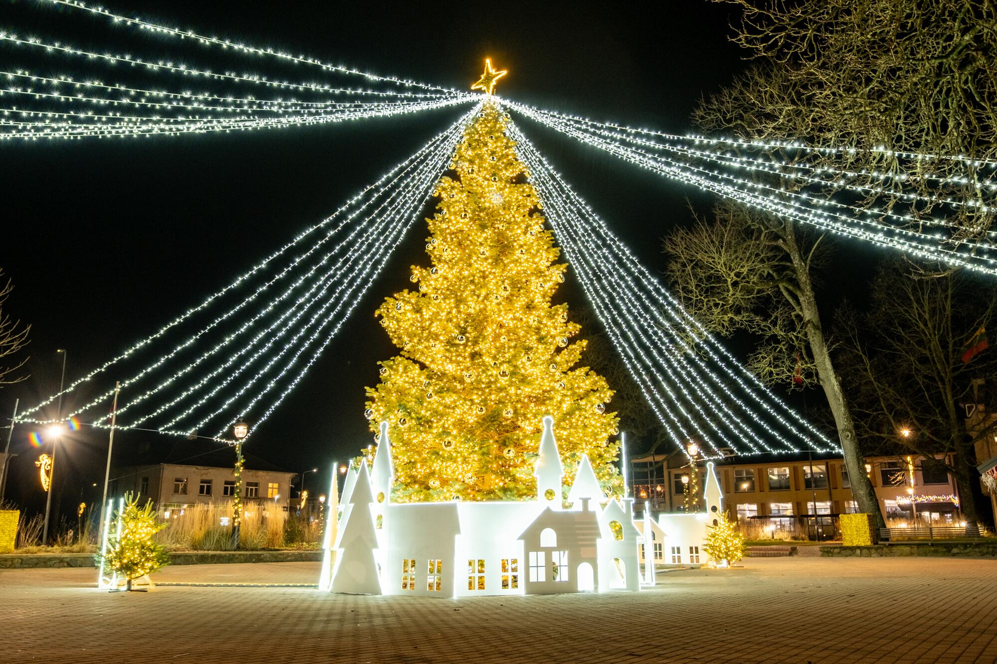 Kretingiškiai jau ketvirtą kartą įžiebė pačių gyventojų dovanotą natūralią eglę, šiemet ji – kretingiškio Dovydo Gaidjurgio dovana. Kalėdų medį puošia net 20 tūkst. lempučių girlianda, pasakišką vaizdą kuria ir LED blykstės bei 200 aukso bei sidabro spalvos rutulio formos žaislų. O žengti į šventišką erdvę kviečia spindintys vartai, prie kurių pasitinka lyg iš miško pasakos atšuoliavę išdidūs elniai.