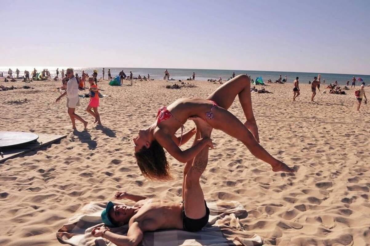 Prie Baltijos jūros atvykusių poilsiautojų žvilgsnius prikaustė žavūs jaunuoliai, kurie atliko akrobatines figūras ant smėlio.