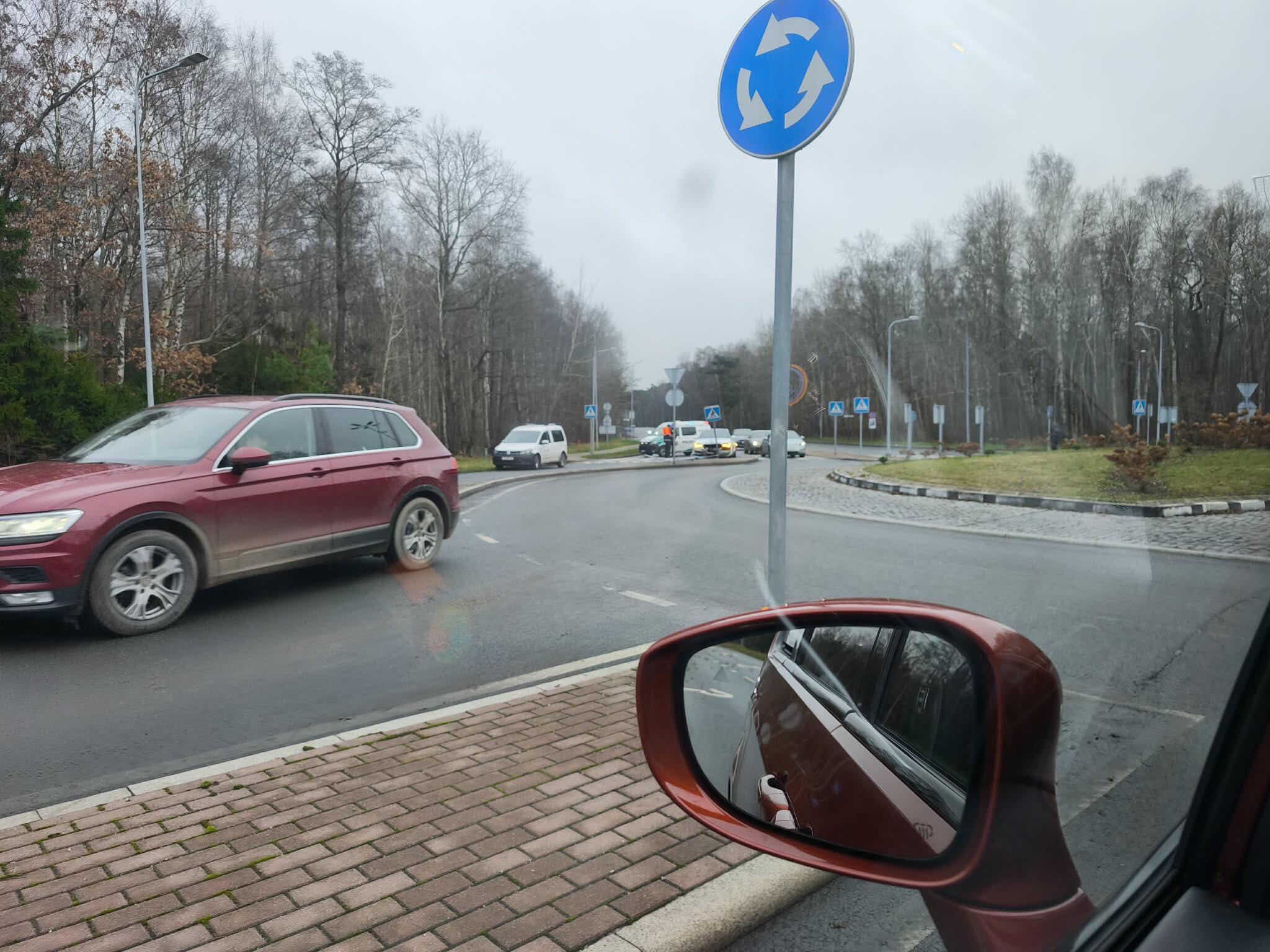 Melnragės žiede užfiksuota situacija – automobilis „Audi“ trenkėsi į salelėje pastatytą kelio ženklą. Nuotrauka eismo įvykio liudininkas pasidalijo socialinio tinklo „Facebook“ grupėje „Klaipėdos Reidai II“.