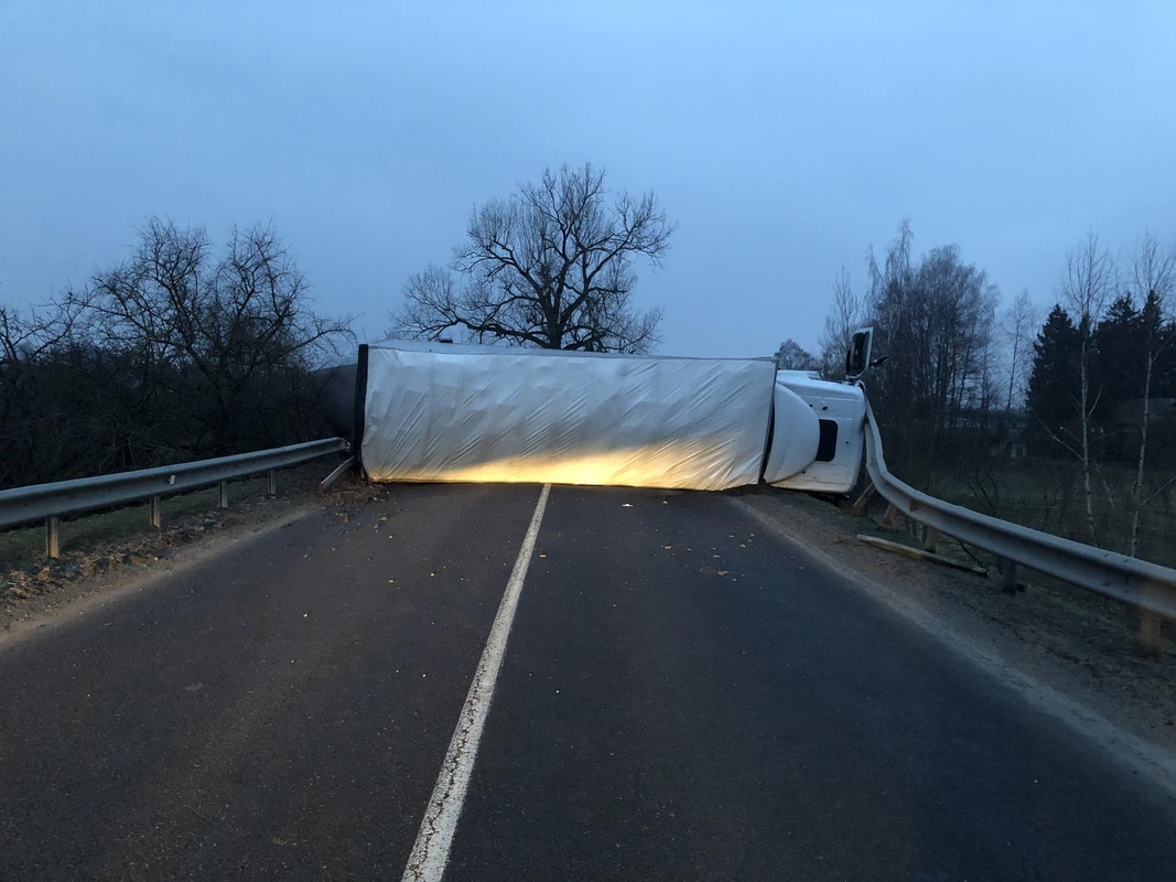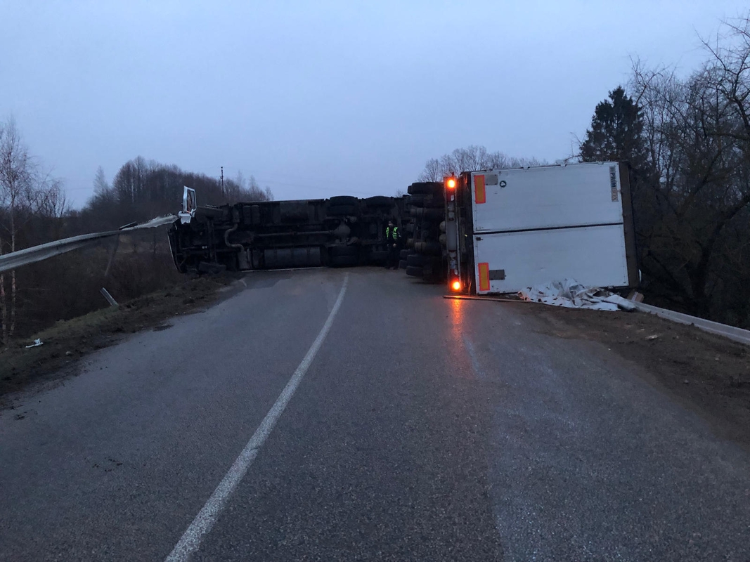 Avarija įvyko apie 6 valandą, kai 1961 metais gimęs baltarusis nesuvaldė vilkiko su puspriekabe ir šis apvirto.