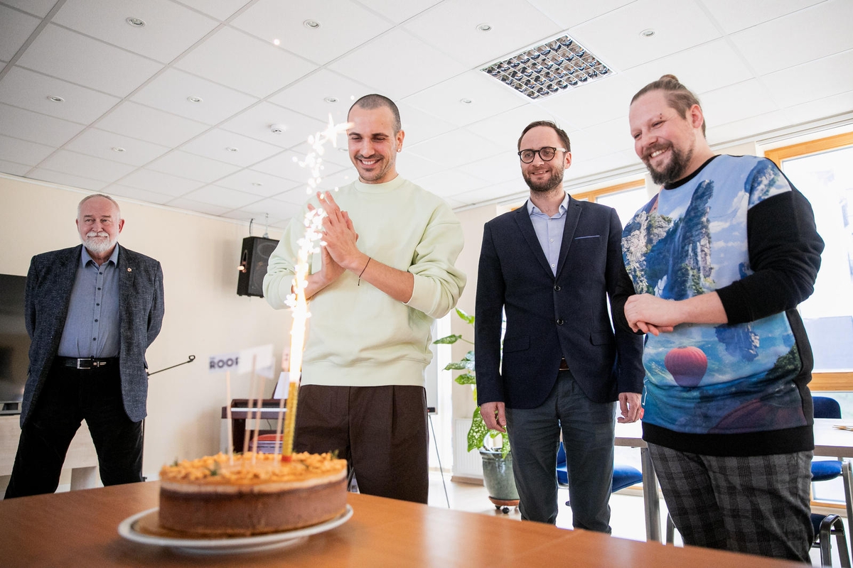 Netrukus muzikantai (jie visi trys yra Asociacijos LATGA nariai, nes dainas kuria patys) buvo pakviesti papozuoti nuotraukai prie torto, papuošto „The Roop“, LATGA ir „Eurovizijos“ simbolika. Užsiliepsnojus fejerverkui grupės lyderis V.Valiukevičius pakomentavo, kad tortas irgi yra on fire.
