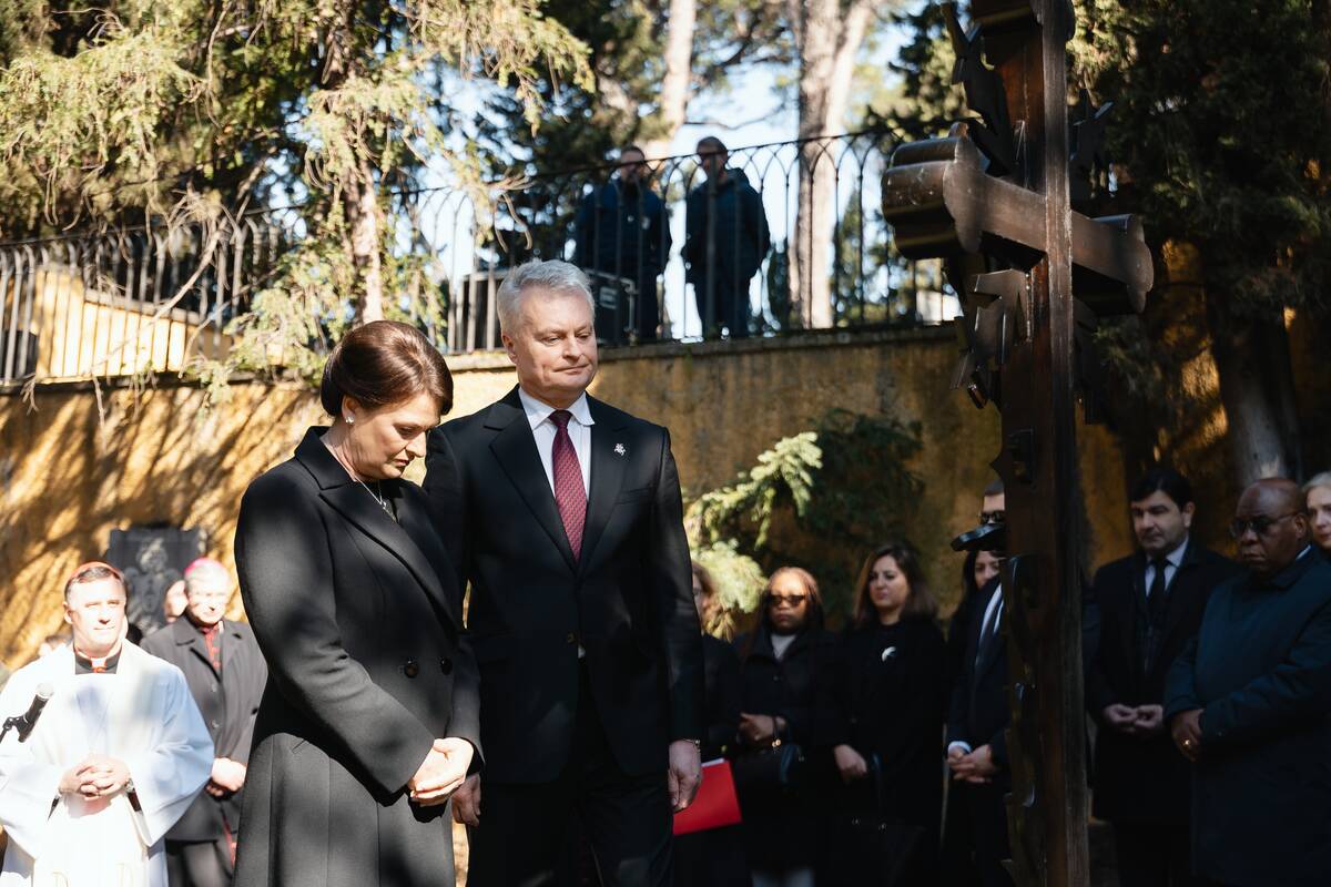 Po susitikimo G. Nausėda, kardinolas Rolandas Makrickas ir Vilniaus arkivyskupas Gintaras Grušas Vatikano soduose dalyvavo atstatyto lietuviško kryžiaus pašventinimo ceremonijoje.