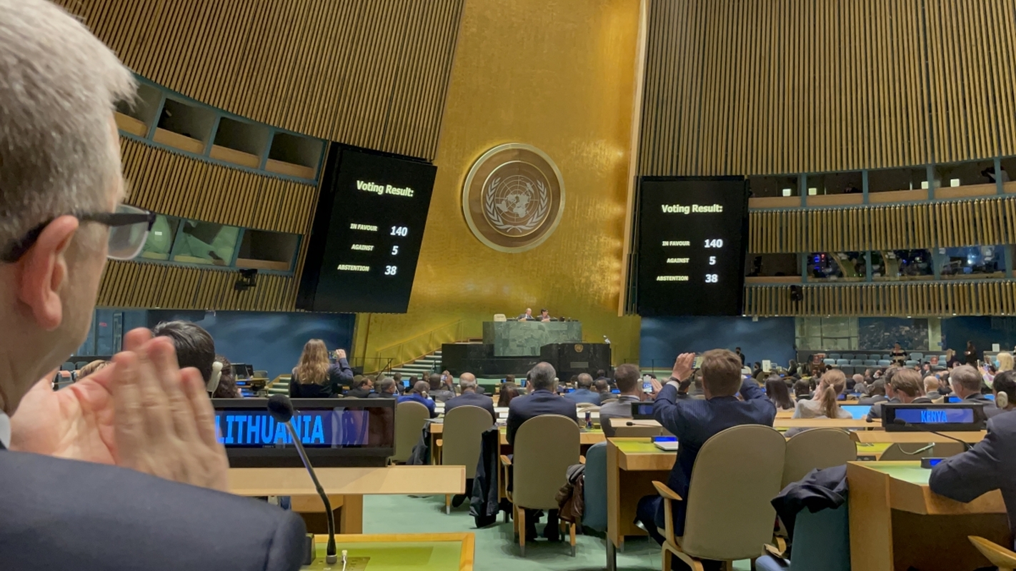 Ukrainos ir grupės šalių, tarp jų – Lietuvos, vardu teikta rezoliucija sulaukė 140 valstybių paramos, penkios balsavo prieš dokumentą, 38 valstybės susilaikė.
