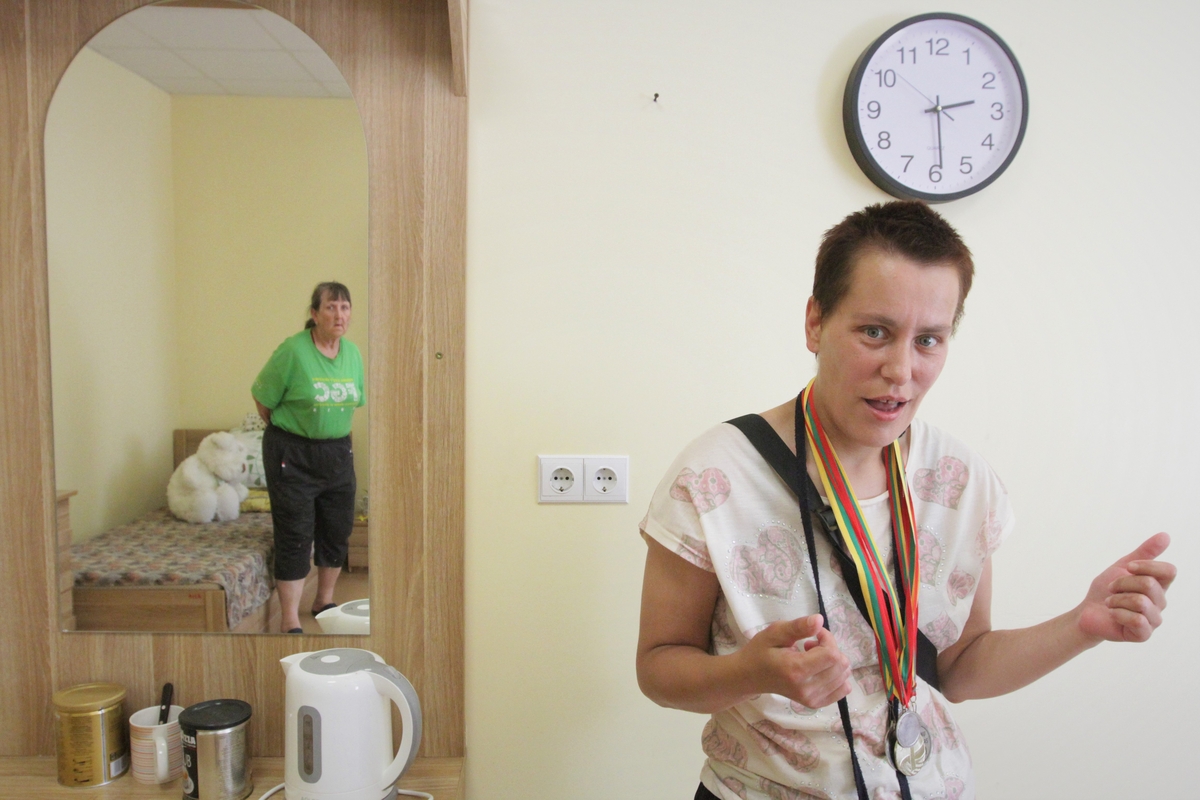 Grupinio gyvenimo namų Marių gatvėje gyventojai Jurgita ir Antanas noriai kviečia į savo kambarį ir džiaugiasi, kad gali papasakoti apie savo kasdienybę. „Nusipirkau televizorių“, – didžiuojasi Antanas.