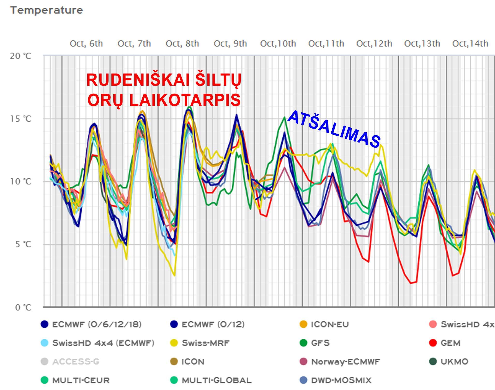 Grafike (paimtame iš meteologix orų svetainės) – pagrindinių orų modelių skaičiavimai. Oro temperatūros prognozė Kauno miestui. Kuo spalvotos linijos tarpusavyje glaudesnės, tuo prognozės patikimumas yra didesnis. Feisbuko mokslo svetainės „Orai ir klimatas Lietuvoje“ informacija.