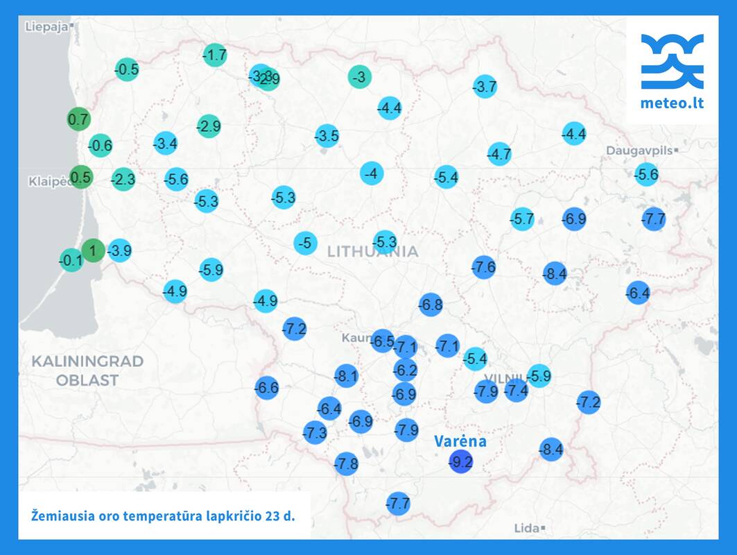 Jų teigimu, šalčio rekordas visgi nepasiektas ir primena, kad lygiai prieš 27 metus (1998 lapkričio 23 d.) Varėnoje temperatūra buvo nukritusi iki 20,4 laipsnio šalčio.