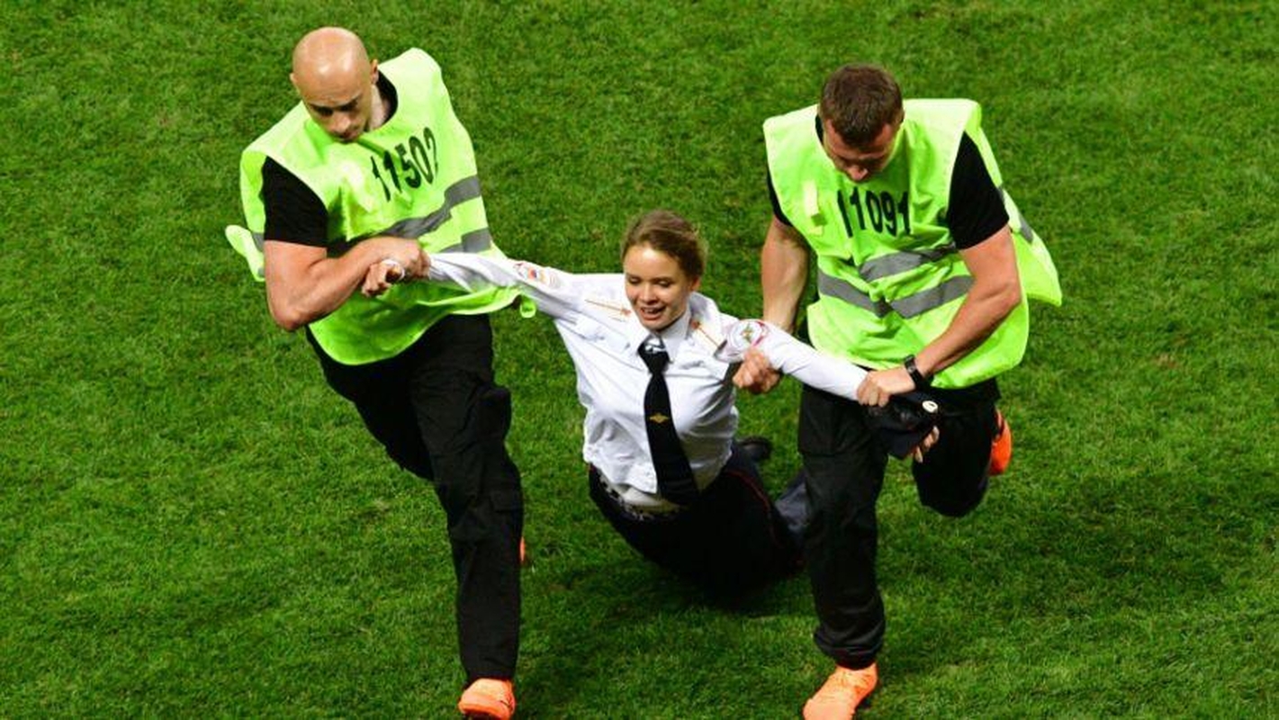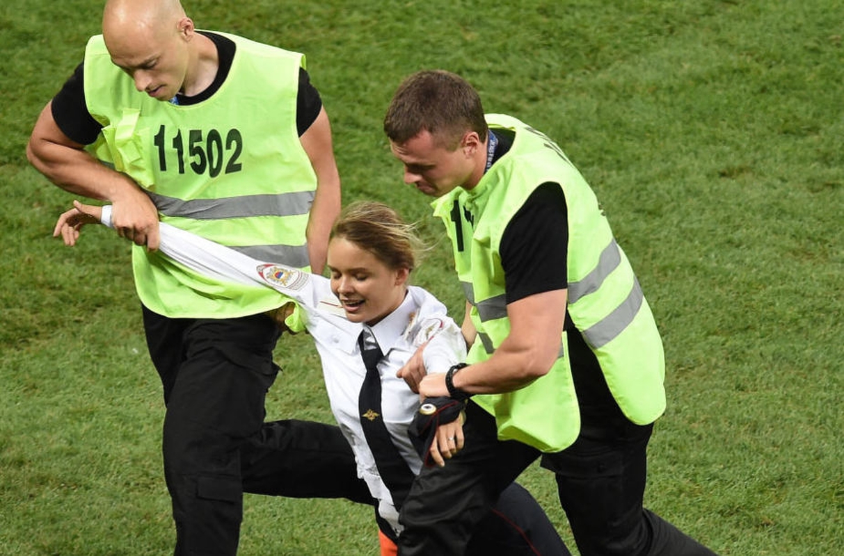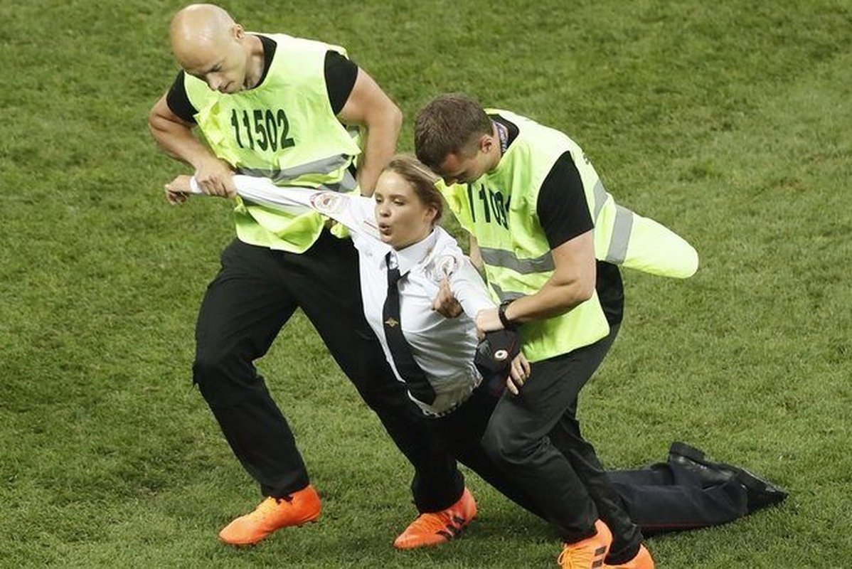 Minėti keturi asmenys sekmadienį įbėgo į Lužnikų stadiono Maskvoje aikštę ir trumpam sutrikdė Pasaulio futbolo čempionato finalinių rungtynių tarp Prancūzijos ir Kroatijos antrąjį kėlinį, stebint Rusijos prezidentui Vladimirui Putinui ir pasaulio lyderiams, tarp jų Prancūzijos prezidentui Emmanueliui Macronui (Emanueliui Makronui).