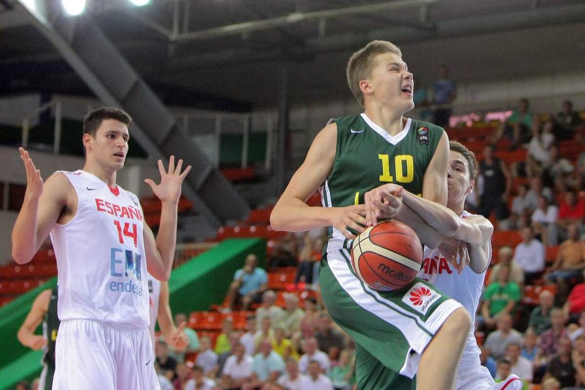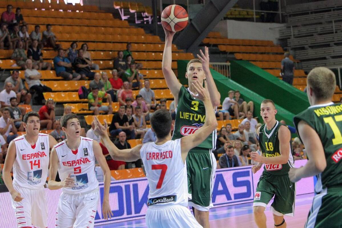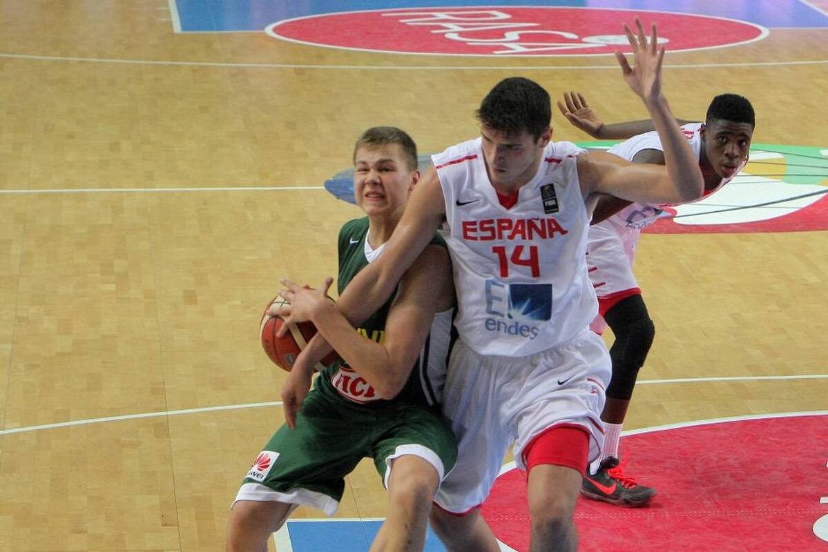 Ketvirtadienį pirmosiose keturių ekipų B grupės turnyro rungtynėse sporto halėje Gedimino Petrausko auklėtiniai 66:61 (16:13, 11:17, 20:18, 19:13) įveikė Ispanijos bendraamžius.
