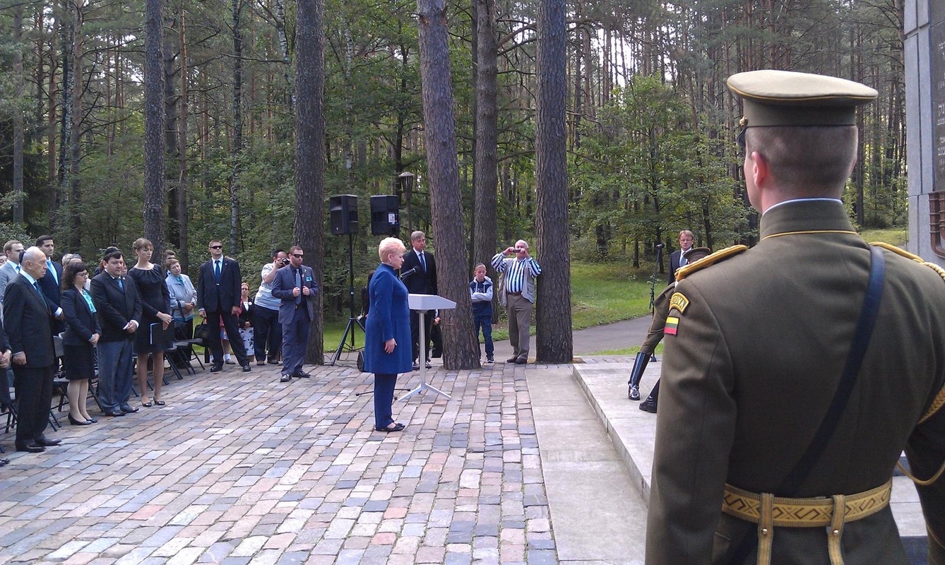 „Šiuo metu mes stovime vietoje, kuri prieš septyniasdešimt metų tapo skausmo, kančių ir mirties vieta. Stovime ant žemės, kuri sugėrė tūkstančių žmonių kraują. Sunku rasti žodžius holokausto žiaurumui išreikšti. Laikas niekada neužpildys šios skausmingos tuštumos kai praradome šią darbščių ir gerų žmonių bendruomenę, sukūrusią „šiaurės Jeruzalę“, - kalbėjo prezidentė.