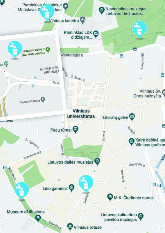 Kaip informavo įmonė, keturios viešos gertuvės įrengiamos sostinės senamiestyje: Odminių skvere priešais Arkikatedrą, taip pat šalia fontanų Rotušės aikštėje bei Vokiečių gatvėje, taip pat Sereikiškių parke.