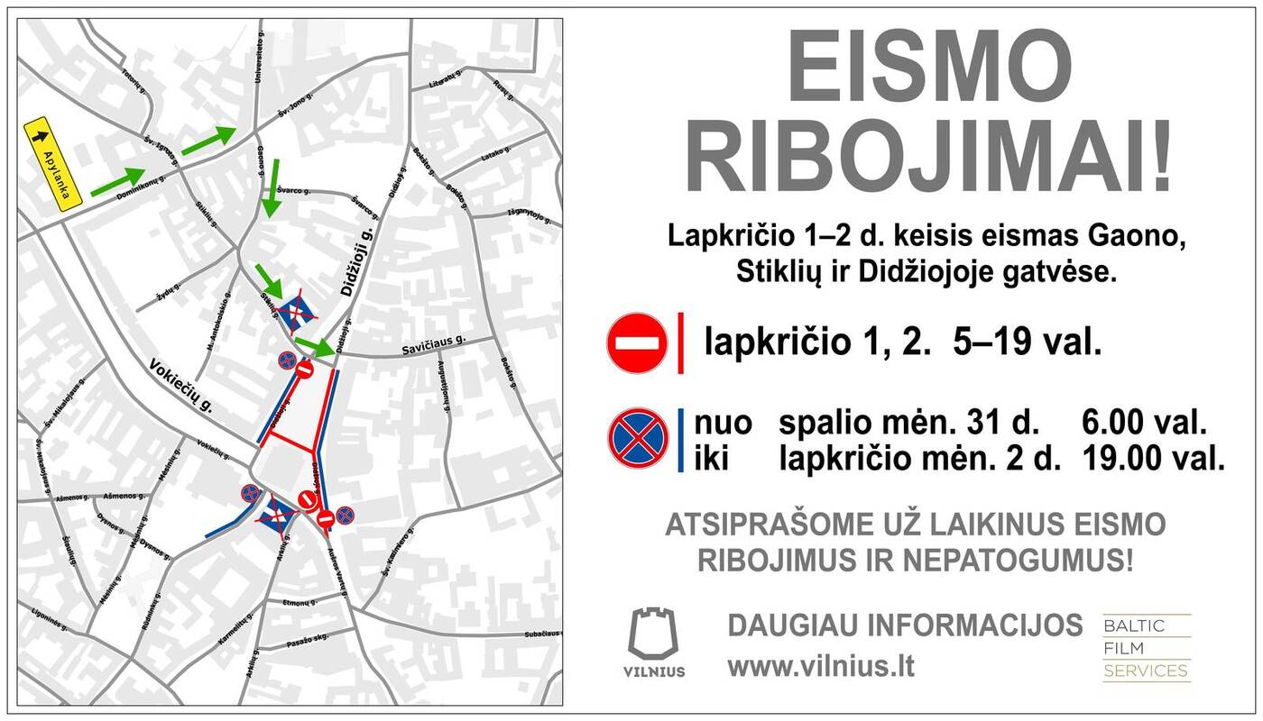 • lapkričio 1–2 d. 5–19 val. draudžiamas transporto priemonių eismas Didžiojoje ir Rotušės a. gatvėse.