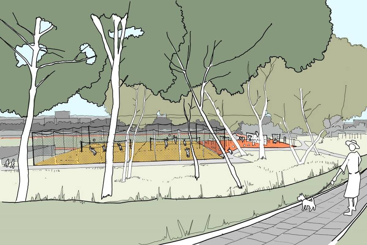 Greta Joachimo Lelevelio inžinerijos gimnazijos stadiono atsiras lauko treniruokliai, tinklinio aikštelės. Šlaito viduryje suplanuota bendruomenės pieva su amfiteatru.