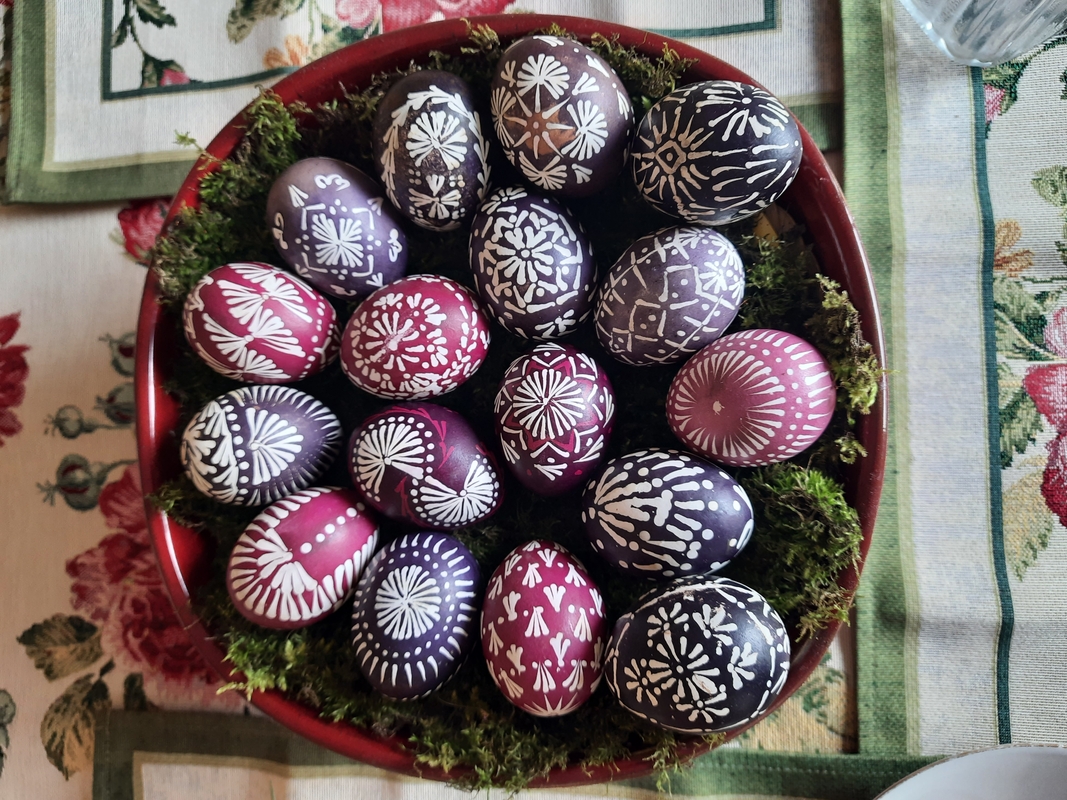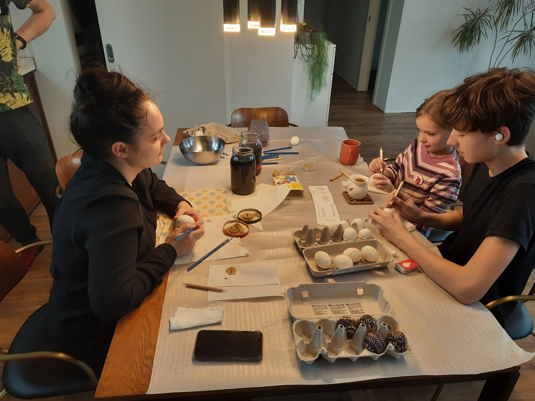 Kai paaugo, atsirado daugiau kantrybės, pradėjo kartu su manimi kiaušinius vašku išrašinėti. Kelios dienos prieš Velykas sėdamės prie stalo visi, kaičiame vašką ir išrašome juos įvairiais tradiciniais lietuvių ornamentais – saulutėmis, eglutėmis, žalčiukais ir kt.