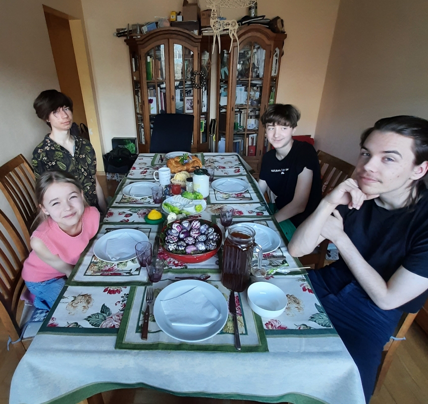 Mūsų pusryčiai prasideda nuo pasidžiaugimo, kad sulaukėme dar vienų Velykų, Kristaus ir gamtos Prisikėlimo. Tada jau visi imame po margutį ir daužiame vienas su kitu, žiūrime, kieno stipriausias.