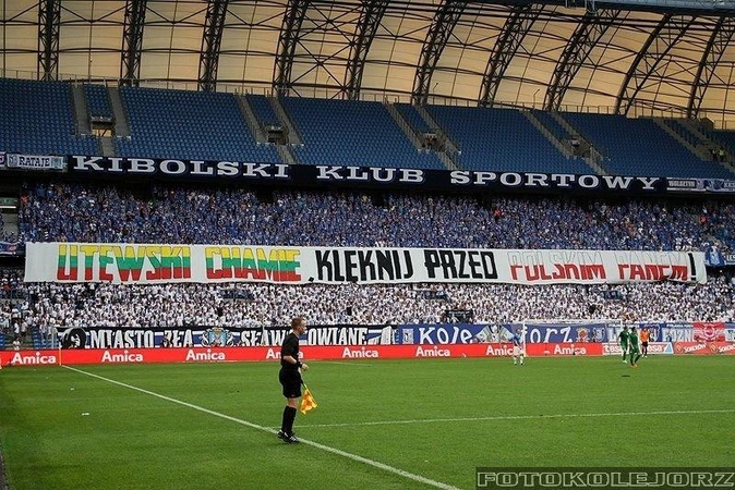 Ekonomika ir politika Lenkija pažadėjo neleisti tokių plakatų, kaip Poznanėje per futbolo rungtynes su „Žalgiriu“